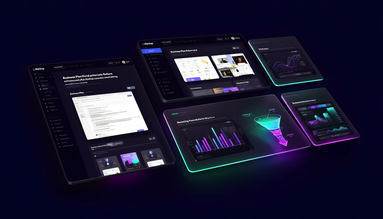 Aperçu de la plateforme Startup Forge avec les outils business plan, pitch deck et analytics